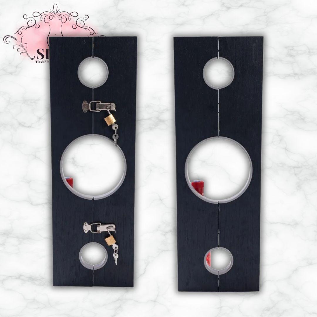 Transforme ta chambre en véritable théâtre de soumission avec ce meuble de contrainte BDSM en bois massif, conçu pour les jeux de domination intenses et les mises en scène les plus sensuelles. Avec ses appuis pour le cou, les poignets et les chevilles, cette structure offre un maintien ferme et sécurisé, parfait pour immobiliser ton partenaire selon tes envies.